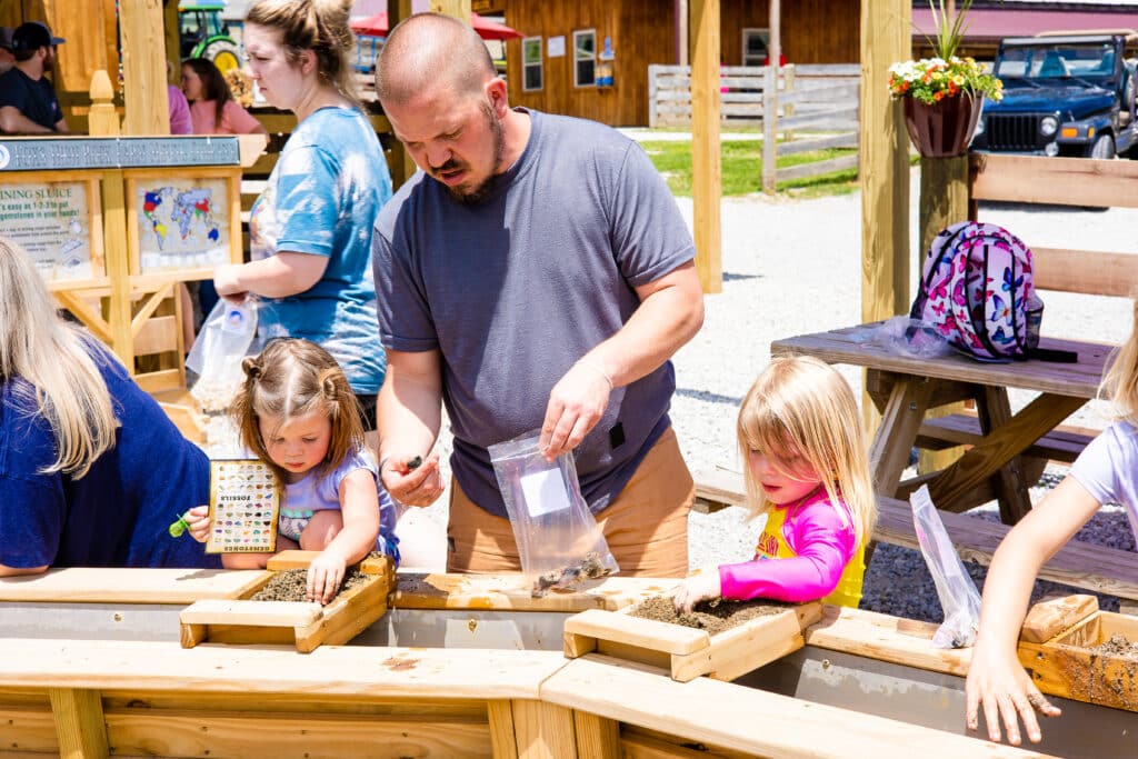 A water trough with screens allows kids (and adults) to swirl the dirt and let lighter sediment wash away, revealing hidden gems.